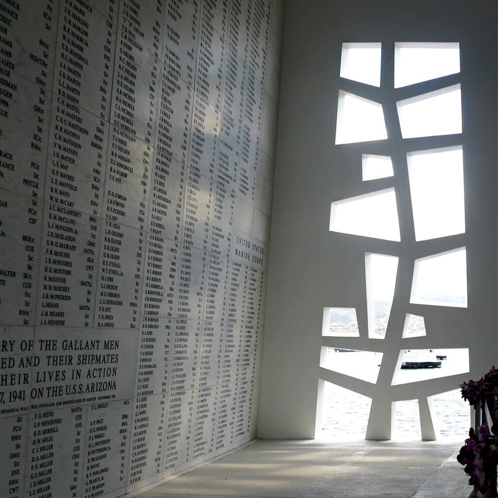 Preis designed a sequence of feelings. Visitors pass through a compressed entry into a sun-washed hall open to the trade winds—rib-like concrete frames and odd-numbered side openings invite air, light, and silence. The center “sag” represents the nation’s darkest hour; the strong ends signal resilience and victory. At the far end, the shrine room lists the Arizona’s dead in marble, while a separate panel remembers crew who survived the attack but later chose to have their ashes interred aboard the ship. The space does not prescribe emotion; it makes room for it.