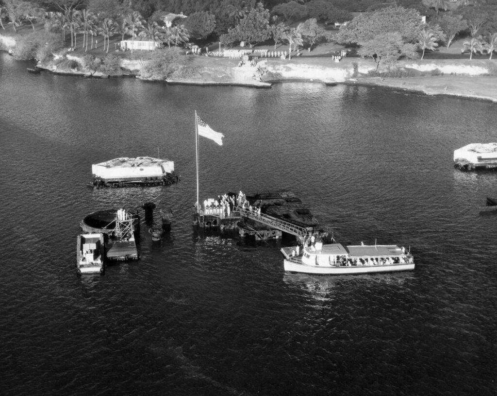 When the battleship USS Arizona (BB-39) exploded and sank on December 7, 1941, she took 1,177 sailors and Marines with her. In the years that followed, the Navy removed much of the ship’s wrecked superstructure, but the idea that the nation should honor the entombed crew where they rest took hold and never let go. Early gestures of remembrance began on the hulk itself; in 1950 Admiral Arthur W. Radford, then Commander in Chief, Pacific (CINCPAC), ordered a flagpole mounted on the Arizona and directed that the U.S. flag be raised and lowered daily over the ship. On the ninth anniversary of the attack, a plaque was placed at the base of that flagpole. These acts formalized the Arizona as a sacred site and kept public attention on creating a permanent memorial.