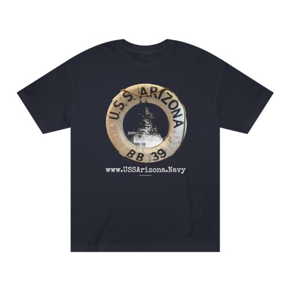 Support the U.S.S. Arizona “Operation 85” Project with this unisex tee for every casual outing. Our beautiful life ring design, pictured with the magestic U.S.S. Arizona battleship BB-39 within. A great item or gift for any Navy, WWII or Pearl Harbor history buff.