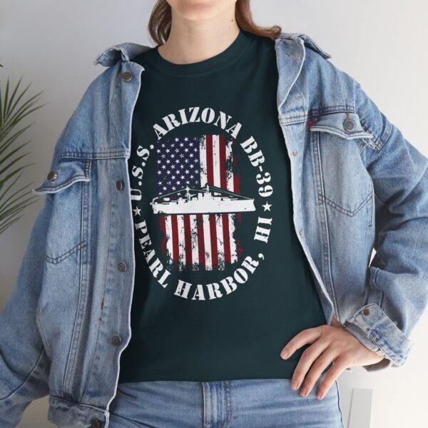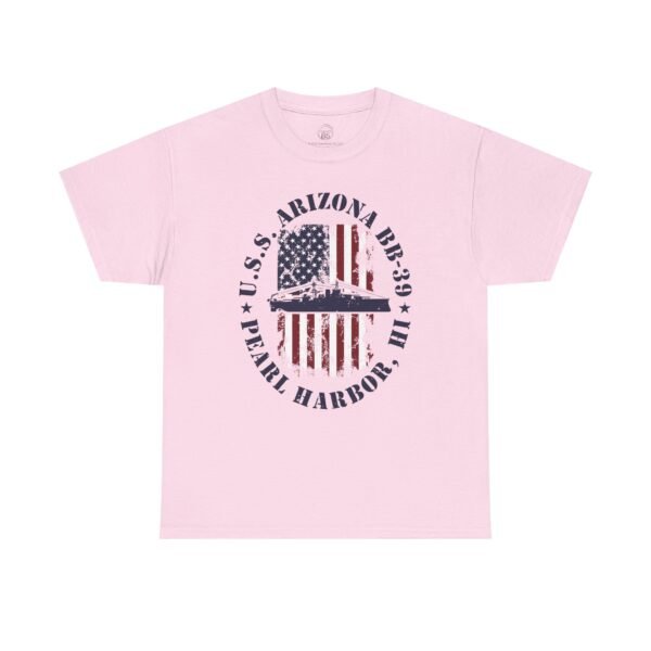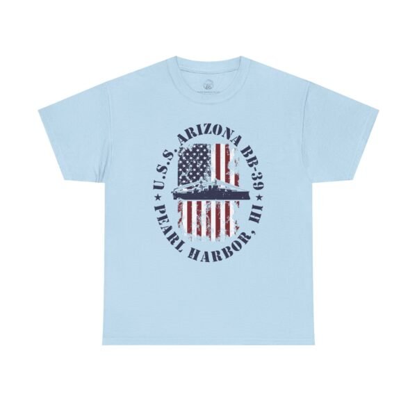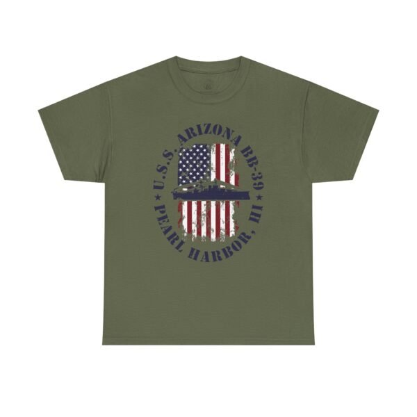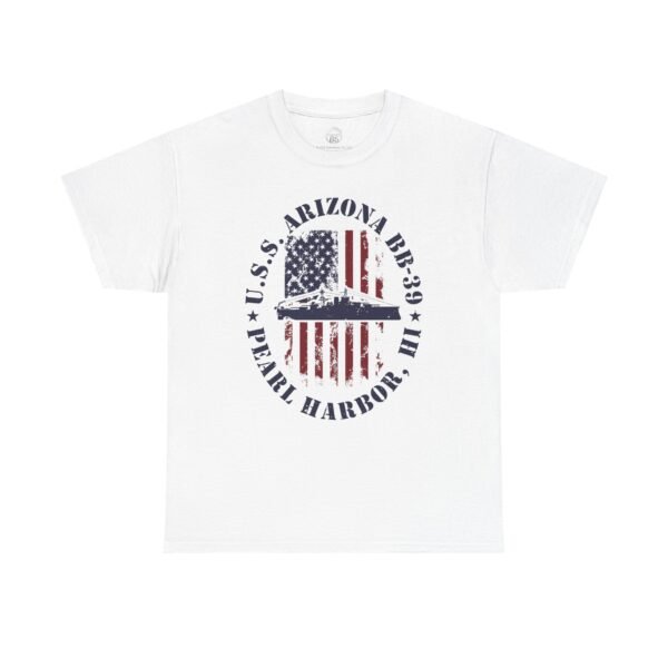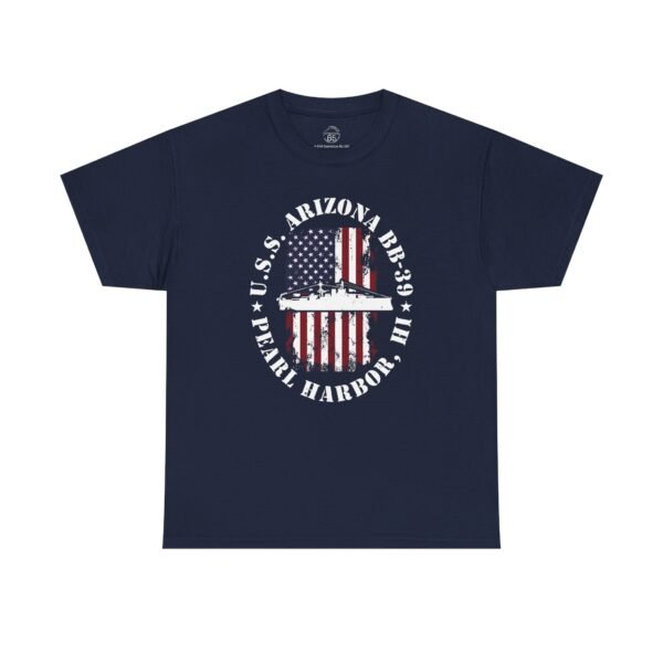 Showcase your American pride and honor history with the USS Arizona BB-39 American Flag Oval Design w/ Pearl Harbor, HI T-Shirt. Featuring a distressed oval American flag backdrop and the powerful silhouette of the USS Arizona, this design serves as both a patriotic statement and a meaningful tribute to the 1,177 brave souls lost on December 7, 1941.
