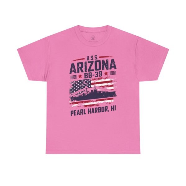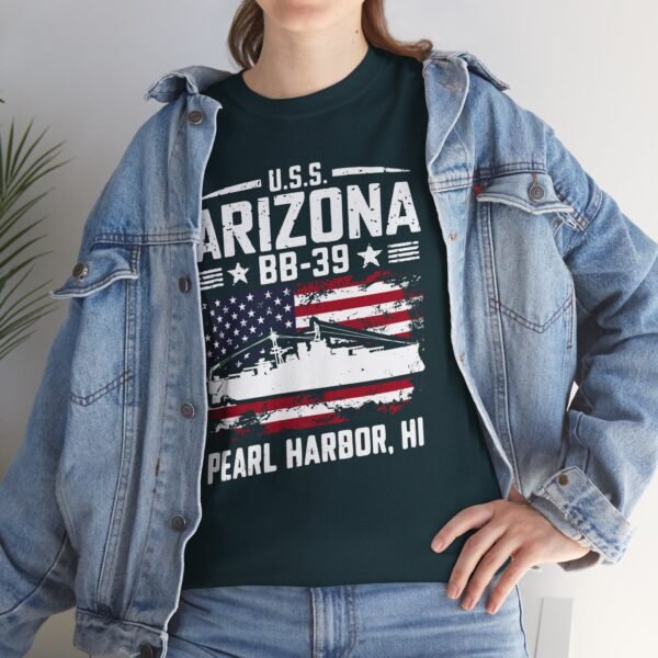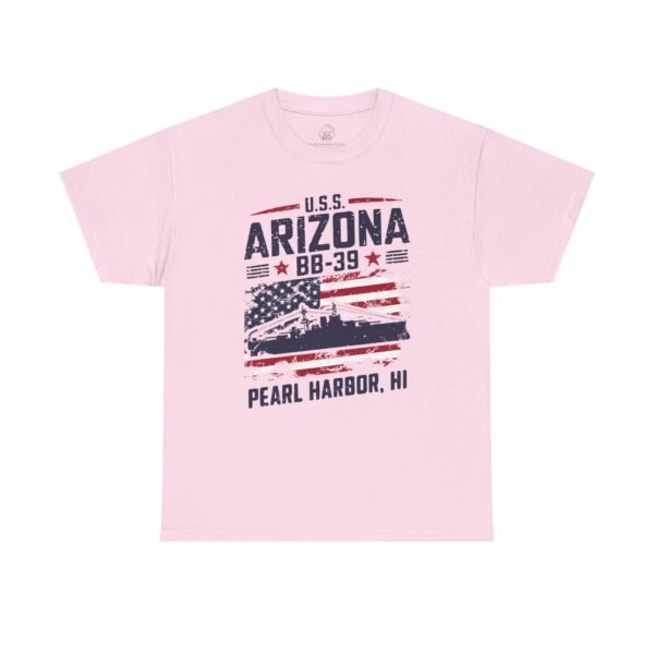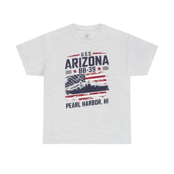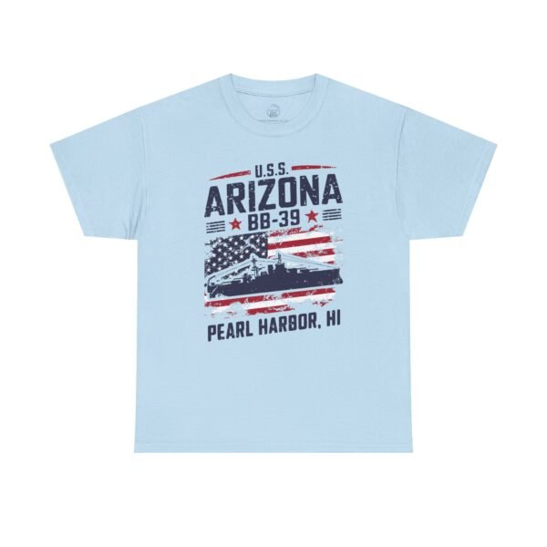 Show your American pride and honor history with the USS Arizona BB-39 Patriotic Flag Tee – Pearl Harbor, HI. This bold design features the silhouette of the USS Arizona set against a distressed U.S. flag, symbolizing strength, sacrifice, and resilience. More than just apparel, it serves as a tribute to the 1,177 sailors and Marines who gave their lives on December 7, 1941, and a salute to all who continue to serve our country.