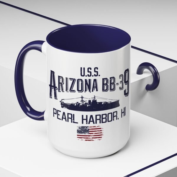 One side showcases a vintage-style illustration of the U.S.S. Arizona BB-39 paired with “Pearl Harbor, HI” and a distressed American flag.