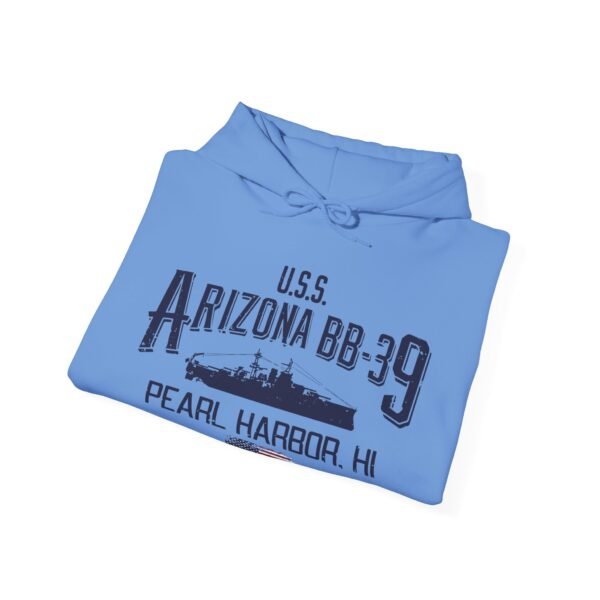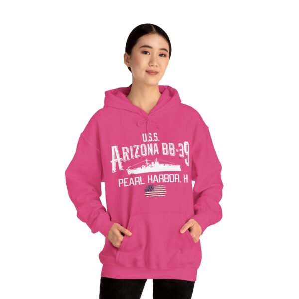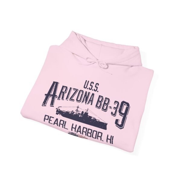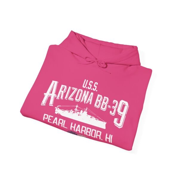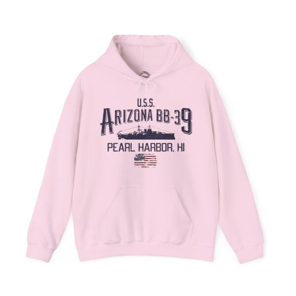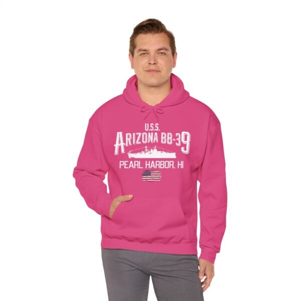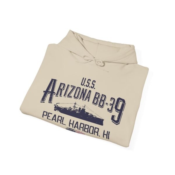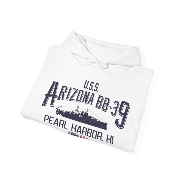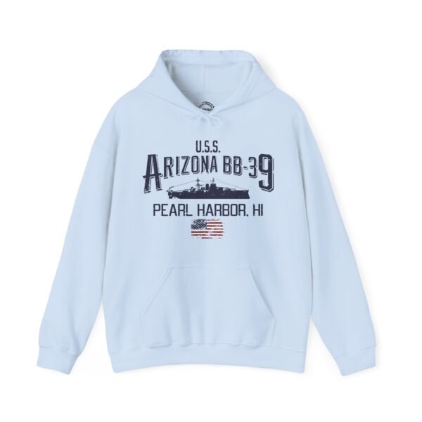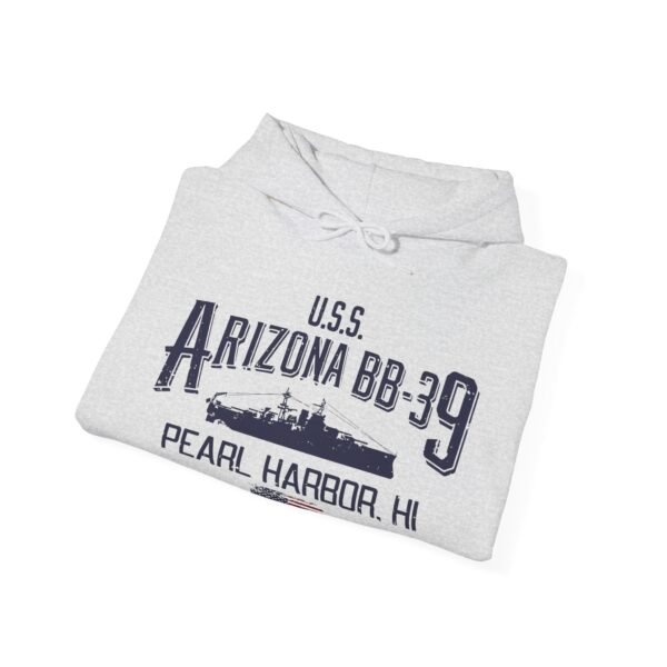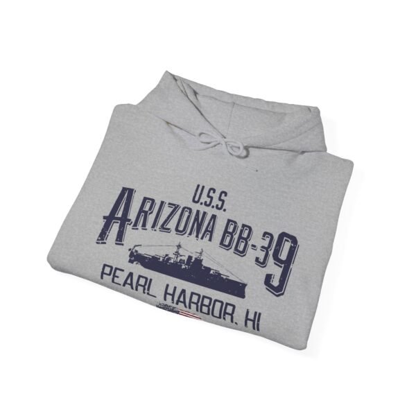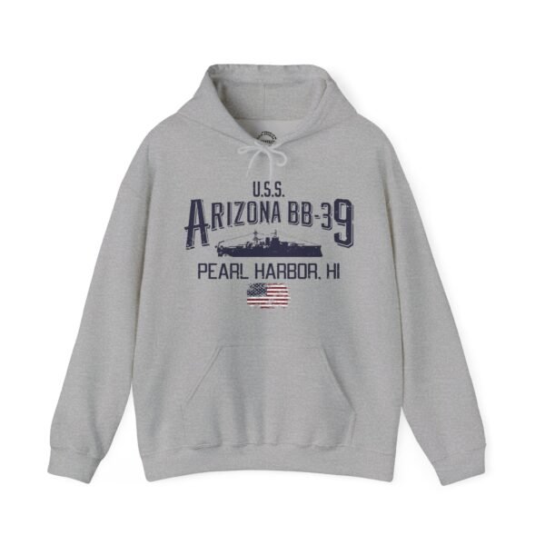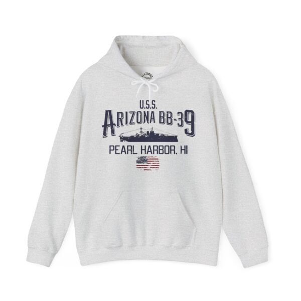 Honor the legacy of the USS Arizona and support Operation 85 with this exclusive Unisex Heavy Blend™ Hooded Sweatshirt. Featuring a bold design of the iconic USS Arizona BB-39, this sweatshirt commemorates the bravery and sacrifice of the crew during the attack on Pearl Harbor. The design prominently showcases the battleship, with “USS Arizona BB-39” printed above and “Pearl Harbor, HI” below, paired with a distressed American flag for added patriotism.
